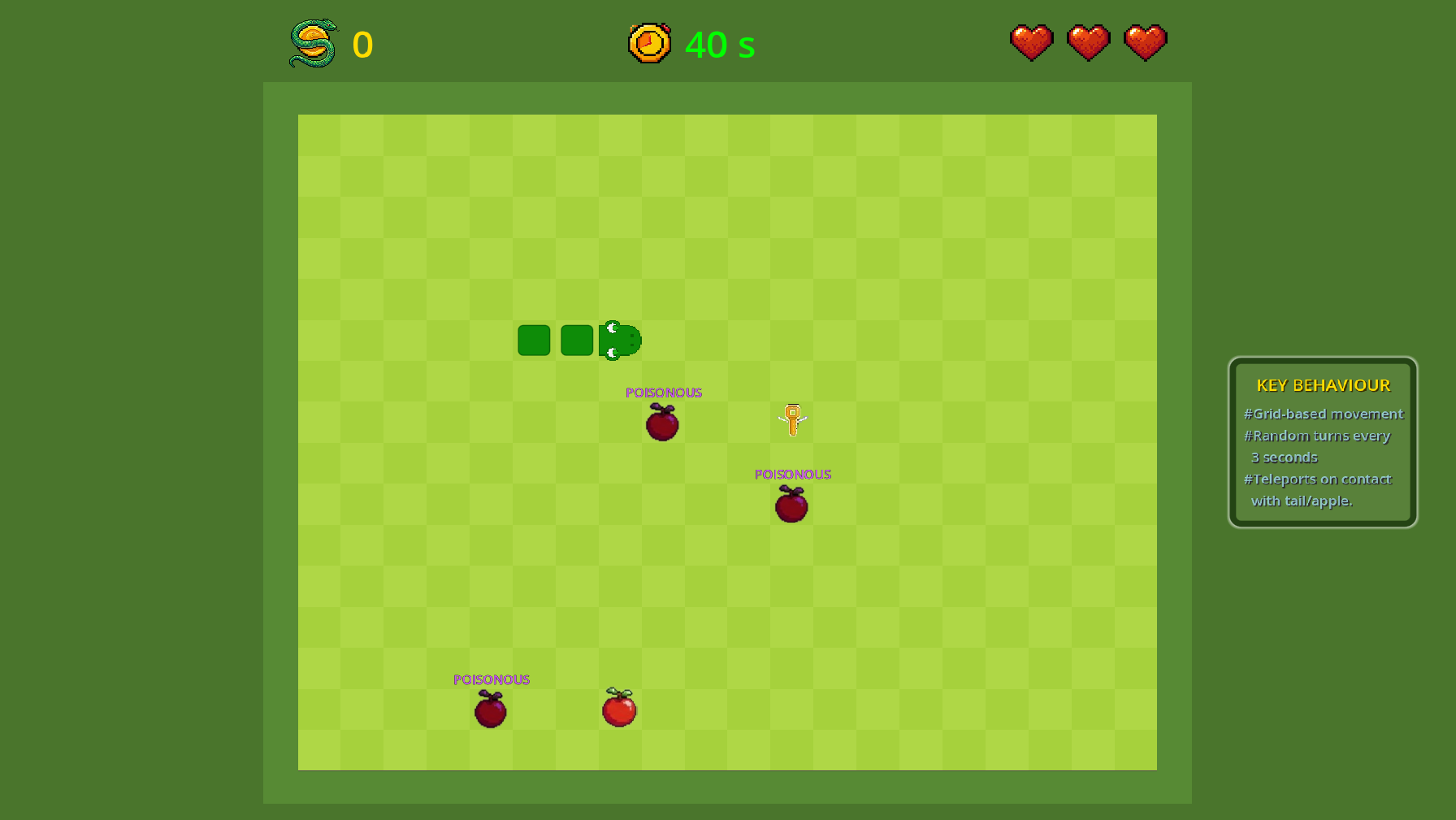 - Goal: Eat fruit 🍎, grab the key 🔑, exit before time runs out ⏱️