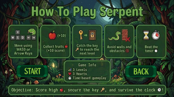 Serpent is a fast-paced puzzle arcade game where you control a slithering snake through maze-like levels. Eat fruit, avoid poison, capture the golden key and move on before time runs out! With retro pixel art, smooth controls and three unique levels of increasing difficulty, Serpent has thrilling challenges perfect for strategic thinking or competitive high-score runs.